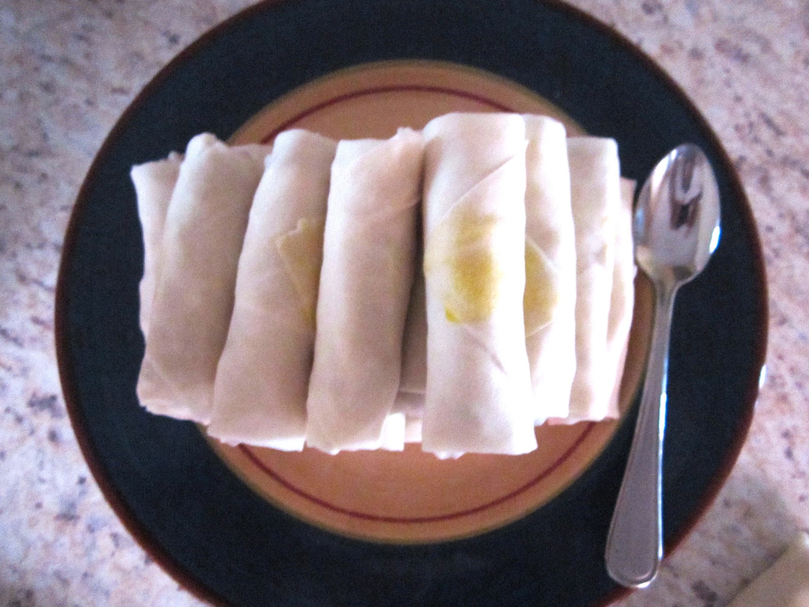 - remove spring roll wrappers from freezer and defrost in fridge or if you don't have time, put each package in microwave for 30 seconds, so that wrappers are easier to separate. separate wrappers and place on a plate. NOTE: though the the wei-chuan brand is made in the USA and also halal, it is wheat flour-based and not ideal for gluten-free diets. i still have to find a gluten-free wrapper that's as good as wei-chuan.